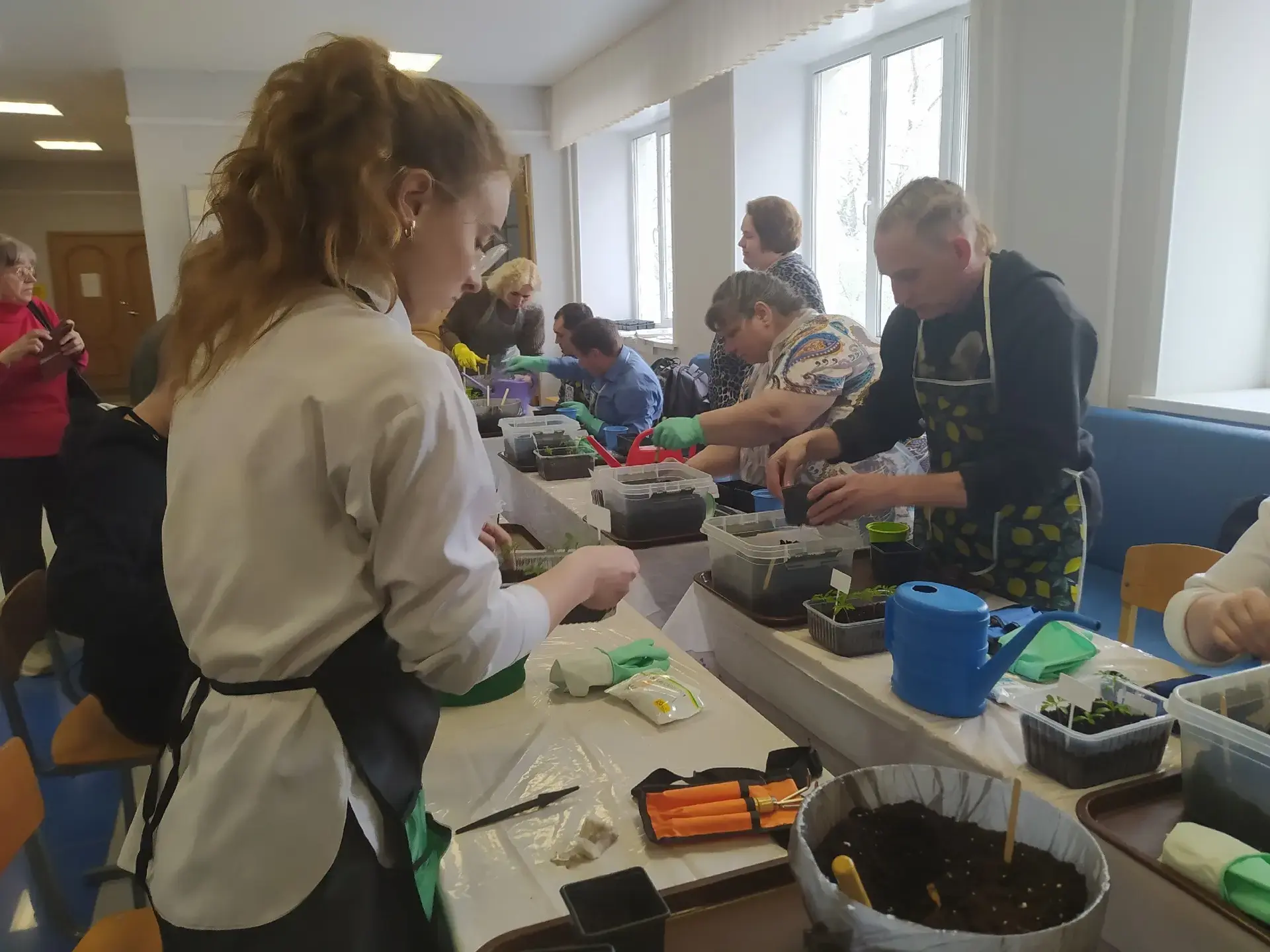 Дмитрий Кормилицын (наш опытный овощевод) успешно справился с пересадкой рассады цветов. Дима применил все свои профессиональные навыки, отточенные в нашей теплице, где летом он с любовью выращивает огурцы, томаты и многое другое.